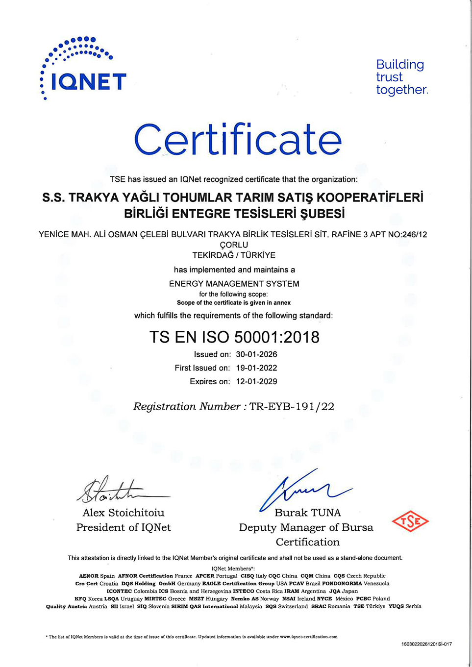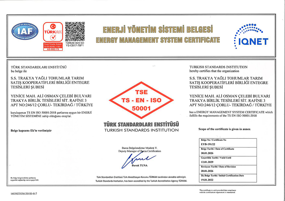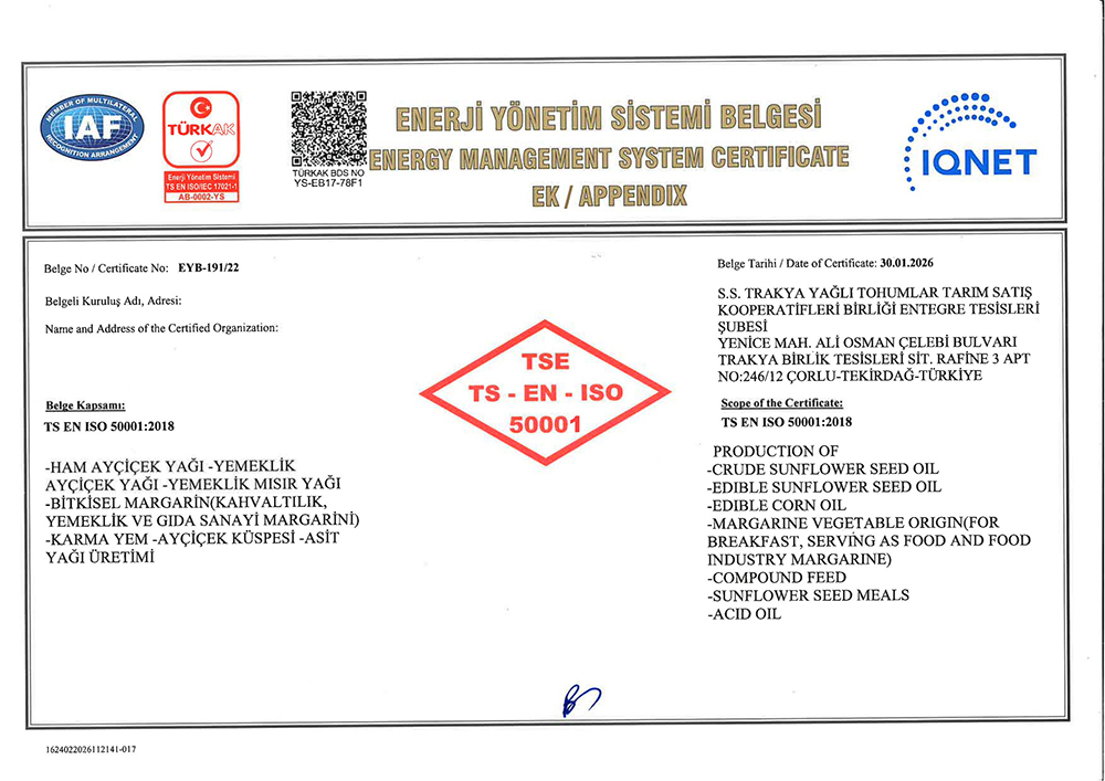 Trakya Birlik olarak faaliyet gösterdiğimiz bitkisel rafine yağ, bitkisel margarin ve hayvancılık sektörü için karma yem ,küspe üretimi ve satışında Enerji tüketimini ve maliyetleri azaltarak enerji performansını sürekli iyileştirmeyi, çevresel ve ekonomik sürdürülebilirliği sağlamak temel politikamızdır.