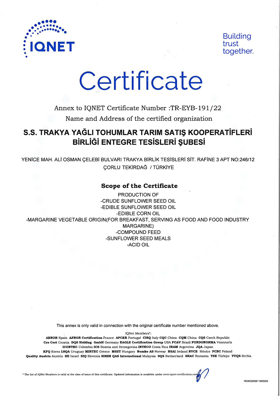 Gücünü üretici ortaklarından alarak; vizyon, misyon ve hedefleri doğrultusunda Bitkisel Yağ ve Karma Yem sektöründe öncü konumda olan TRAKYA BİRLİK Ayçiçeği ürününün en iyi şartlarda işlenmesi sonucunda ulusal bazda SAĞLIKLI, GÜVENLİ, LEZZETLİ mamul ürünler üreterek kooperatifçilik ilkeleri doğrultusunda hizmet vermenin getirdiği sorumluluk ve bilinçle hareket etmektedir.